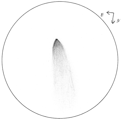 "Havaitsin komeetan tänään Ursan tornilla, jossa se pilkisti horisontin Ac-lautan raosta noin viideksi minuutiksi. Paljain silmin komeetasta näkyi silmiinpistävän kirkas ydin sekä ehkä noin puolen asteen verran pyrstöä. Kiikarilla pyrstöä näkyi paljonkin enemmän, mutten saanut sen pituudesta oikein mitään arviota. Celikalla pisti silmään koman pieni koko. Huonon seeingin takia itse ydin suhraantui aika tavalla ja sekoittui komaan niin, ettei niitä juuri pystynyt erottamaan toisistaan. Aivan sisimmän pyrstön reunat näyttivät keskiosaa kirkkaammilta vielä niin, että itäinen reuna oli mahdollisesti läntistä hieman kirkkaampi. Tämä toisaalta saattoi olla myös kontrasti-ilmiö pyrstön kirkkaimman alueen kohdalla. Toisaalta olin näkevinäni jonkinlaisia epäsymmetrisyyden merkkejä sisimmässä pyrstössä myös kiikareilla. Muutoin pyrstö oli erikoisen tasainen ja selvärajainen, kuten kuvissakin, ja himmeni tasaisesti ytimestä poispäin. Tein komeetasta myös piirroksen yhdistellen kiikarin ja Celikan näkymiä."