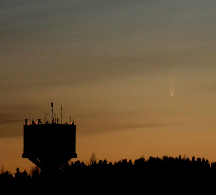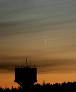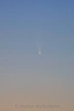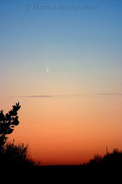 "Tänään vihdoin Ilmajoellakin taivas oli vihdoin horisonttiin saakka selkeä, joten pääsin vihdoin kuvaamaan komeettaa "läheisen" peltoaukean reunalta. Hyvin näkyi ja reilussa kymmenessä minuutissa kortille siirtyi kuutisenkymmentä kuvaa."