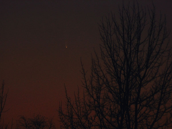 "En tänäänkään malttanut jättää komeettaa rauhaan. Edellisinä päivinä yli 90% taivaasta oli ollut pilvessä, mutta komeetan edessä kirkas rako. Nyt oli päinvastoin, kirkas taivas, mutta komeetan edessä pilvitöhnää. No, komeetta tuli kyllä näkyviin kun pilvet ohenivat ja siirtyivät. Komeetta oli mielestäni samanoloinen kuin eilen. Luultavasti kuitenkin kirkkaampi, mutta pilvet haittasivat näkyvyyttä. Näin myös Venuksen ja vertailin komeettaa siihen epäterävöittämällä kiikarikuvaa. Mielestäni komeetan ydin oli kirkkaampi kuin Venus, vaikka komeetta oli huomattavasti matalammalla."