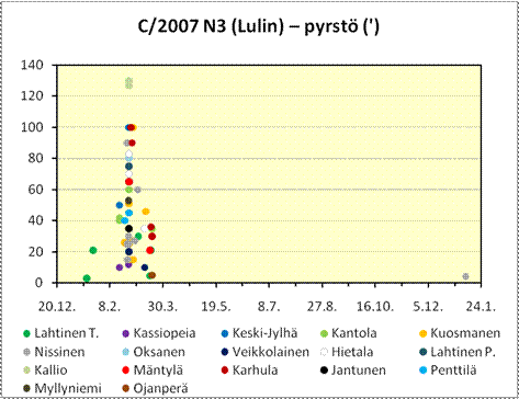 | Pyrstö | pyrstön pituus asteissa (°) tai kaariminuuteissa(') sekä pyrstösuunta (PA) |