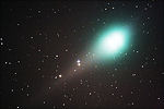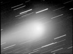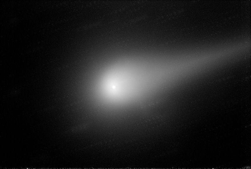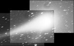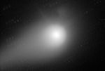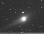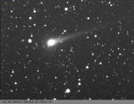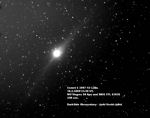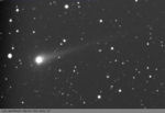Veli-Pekka Hentunen ja Markku Nissinen, "Härkämäellä kuvattiin komeetta aamuyöllä. Kohde mahtui juuri CCD-kameran kenttään. Kuvakentän koko on 22' x 14', oheisessa kuvassa cropattu kokoon 11'x11'. Negakuvasta näkyi että koma ulottui lähes kuvan laidasta laitaan. Kuvan alaosassa on näkyvissä komeettaan kuuluva jännä nauhamainen kiehkura. Kohde oli matalalla etelässä." |