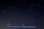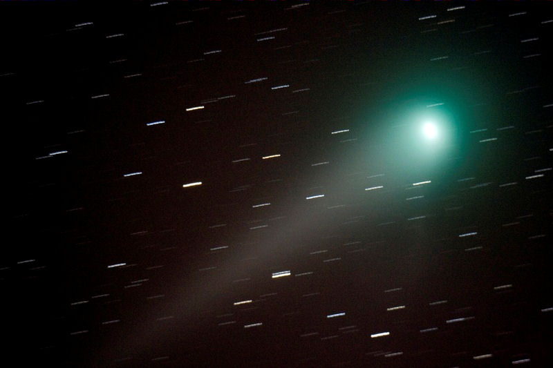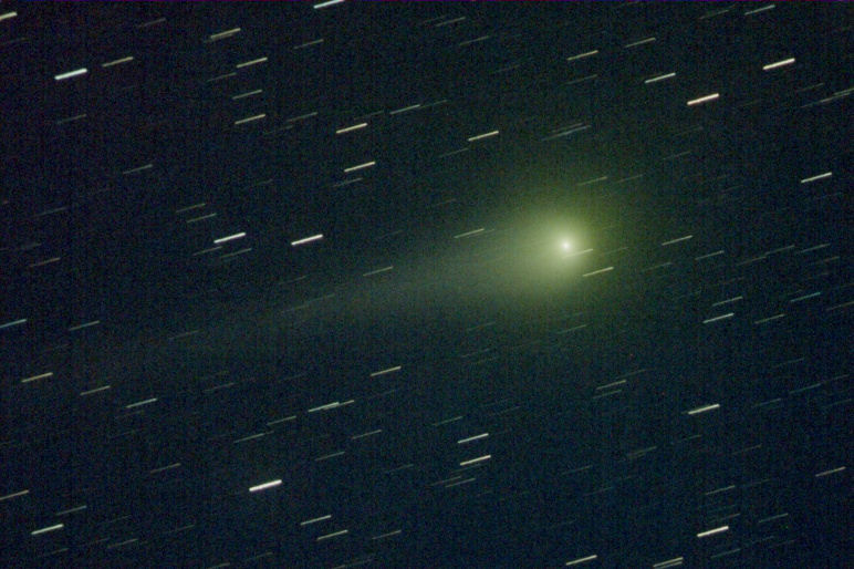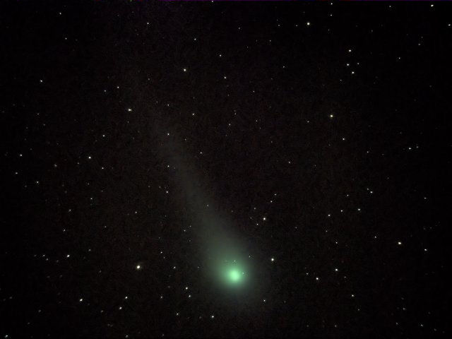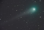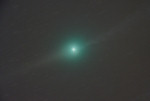 Juha-Matti Penttilä, Halsua "Komeetta löytyi helposti 7x50-kiikareilla, mutta en löytänyt komeettaa paljain silmin, vaikka taivas oli varsin tumma. Isolla kaukoputkella kuvatessa komeetta liikkuu nopeasti eri kuvien välillä. Tämä kuva pinottu tähtien mukaan, jolloin komeetan komasta tulee pitkulainen." |