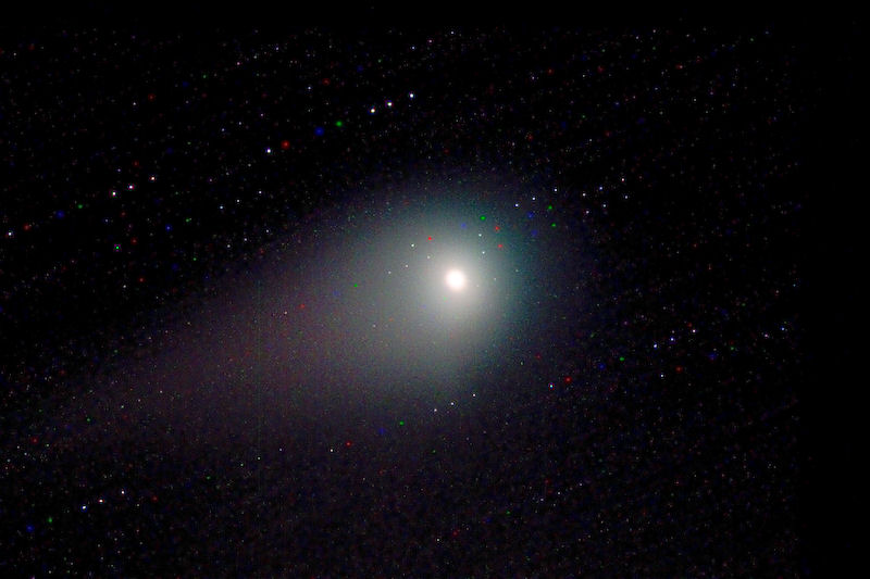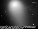 Markku Nissinen, Moorok, AUSTRALIA (D90) "Kuva on otettu kaukokäytöllä Australiassa Moorookissa sijaitsevalla GRAS 12 kaukoputkella. Kuvaa on käsitelty siten, että tähdet tulevat vain yhteen kertaan kuvaan. Aivan täysin ei kanavien vähäisen kuvamäärän vuoksi monivärisiä tähtiä pystynyt häivyttämään ja muutamissa kohdissa näkyy siitä johtuvia seikkoja. Kuvaa on lisäksi käsitelty poistaen etenkin sinisen kanavan tähtien himmeitä "haamuja". Ytimestä on tullut hieman pitkulainen ja kaksiosainen, mitä se ei todellisuudessa ole. Kuvasta olisi tullut paljon parempi, jos värikanavia olisi ollut esimerkiksi 10 kpl kutakin. Kirkas tähti komeetan vieressä on Rho Leonis. Kuvaa on rajattu." |