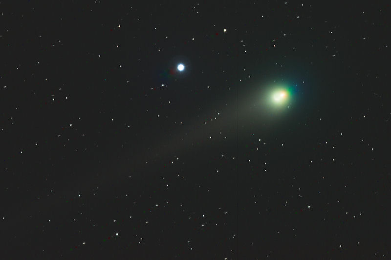 Tapio Lahtinen, Tampere "Komeetan kirkkaus tässä vaiheessa jo luokkaa 6,5, mutta en silti löytänyt kaupunkioloissa 8x50-etsinputkella. Kuva koostettu 10, 20 ja 30 sekunnin valotuksista. Yhdistetty kahdesta kuvasta joista toisessa kohdistus komeettaan ja toisessa tähtiin." |