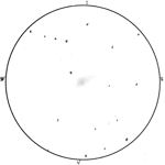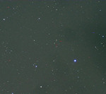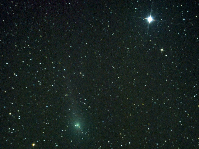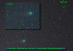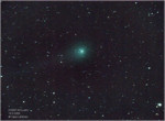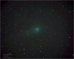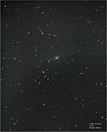 Tapio Lahtinen, Tampere "CCD-kameran virtalähde hyytyi, joten vaihdoin sen tilalle digijärkkärin ja otin pienin odotuksin muutaman ruudun. Jälkeenpäin ajatellen tulos oli yllättävän hyvä, joten olisi pitänyt valottaa kauemmin/useampi ruutu. Jopa pyrstöä erottuu, varsinkin vihreän värikanavan otoksessa. Ensimmäisessä kuvassa pinottu kohdistaen komeettaan. Toisessa pinottu kohdistaen tähtiin ja kolmannessa vihreä värikanava pinottu kohdistaen komeeettaan." |