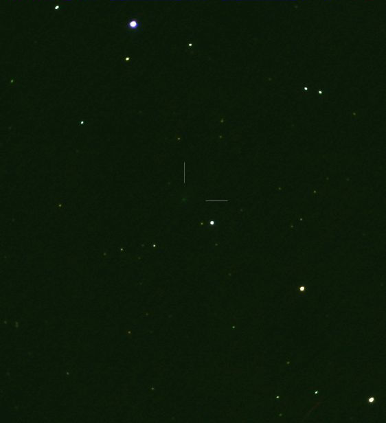 Esko Lyytinen, Helsinki, Pukinmäki Klo 0.07 Klo 1.01, koma 3' "Minulla ei ollut Helsingissä minkäänlaista seurantajalustaa, joten yritin kuvata kiinteällä jalustalla. Oli revontulia samaan aikaan niiden kuitenkaan häiritsemättä korkealla taivaalla. Kuvat on pinottu ja edelleen IrfanViewillä säädetty kirkkauksia, kontrasteja ja värejä sekä rajattu kuvaa. 180-millisen kuvista, tästä ja toisesta eri kuvista tehdystä käsittelemällä enemmän kontrastia sain koman läpimitan. Katsoin kohdetta myös kiikareilla. Alkuun se oli vaikea kohde ja näkyminen aika 'marginaalista', koska komeetta oli liian lähellä tähteä. Myöhemmin se vähän etääntyi ja nousi korkeammalle, ja pimenikin vähän lisää, jolloin kohde näkyi jo kohtalaisen hyvin. Sain, kirkkauden epätarkka-epätarkka-menetelmällä. Kirkkaus oli sama kuin SAO 9963:lla (mag 8,1). Myös kahden tähden rykelmä, joista toinen kaksoistähti (yksi näistä SAO 9951) näytti myös defokusoituna yhtä kirkkaalta kuin komeetta. Sain laskemalla kolmen tähden kokonaiskirkkaudeksi 7,9 eli melko saman arvon. Lopputuloksena voisi pitää mag 8,0. Sinällään olosuhteet olivat täkäläisiksi hyvät, yläpilviä alkoi lopussa tulla, mutta ilmeisesti eivät vielä häirinneet." |