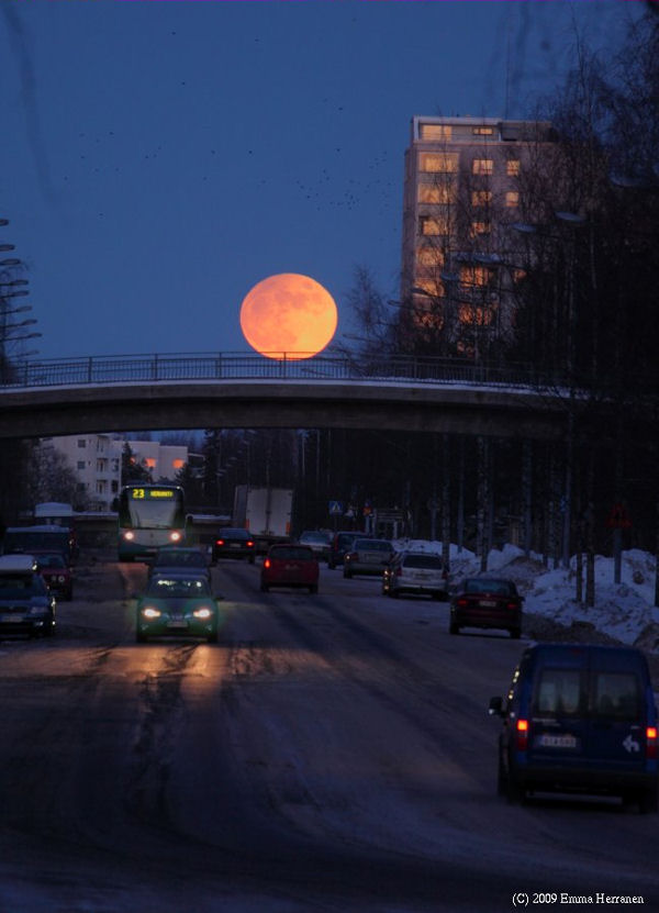 Kari Nyman, Tampere, Kauppi Klo 17.03 "Kuun puolivarjopimennys Tampereen Ursan tähtitornilla kuvattuna koillisen suuntaan täydenkuun ollessa noin 1 asteen korkeudella." Ks. myös http://tinyurl.com/d5p9l3 |