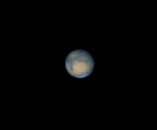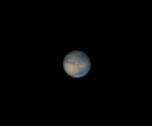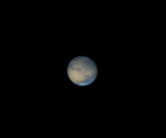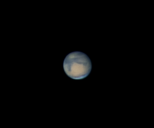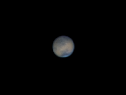"Toinen kerta Marsin kuvausta. Erittäin kova tuuli ja kehno seeing tuottivat myös kehnon lopputuloksen. Pinottu 300/600 kuvaa K3CCDTools-ohjelmalla ja kasvatettu kokoa kaksinkertaiseksi."