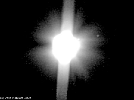 "Kuvailin tässä reilu viikko sitten Marsia vähän pidemmällä valotuksella, että saisin kuut esiin. Vääntelin Registaxilla noita ja koskaan en saanut kun Phoboksen esiin, joten melkein jo luovutin. Päätin kuitenkin vielä kokeilla Iriksellä ja kas, nehän tulikin aika helposti esiin. Kuva on resamplattu 2x. Phobos näkyy juuri ja juuri marsin hohkan reunalla, Deimos selvästi paremmin kauempana planeetasta."