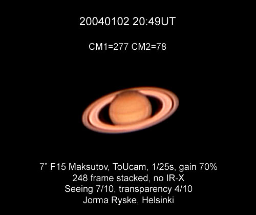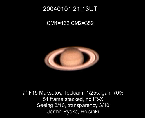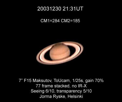 "Kuva koostettu seuraavalla tekniikalla; aluksi otettu seitsemän 60 sekunnin pituista otosta (10 kuvaa/sek.) ja näistä 600 ruudun otoksista valittu 40 ruutua. Nämä parhaat ruudut (7 X 40) koostettu sitten Registax-ohjelmalla. Sävyjä myös säädetty ja kasvatettu kokoa kaksinkertaiseksi. Toistaiseksi paras kuvani Saturnuksesta. Vaivaa kuvan tuottaminen vaati mutta mielestäni kuva on vaivan arvoinen."