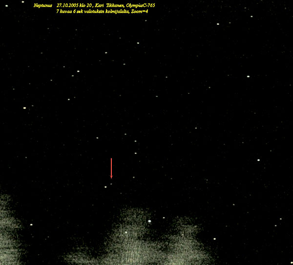 "Kuvasin kolmijalalta ilman seurantaa. Ison kentän perältä piti kuvata ja sittenkin tahtoi etelässä oleva Neptunus hipoa kuvan alaosassa näkyviä koivuja. Läpinäkyvä hyvä ilma."
