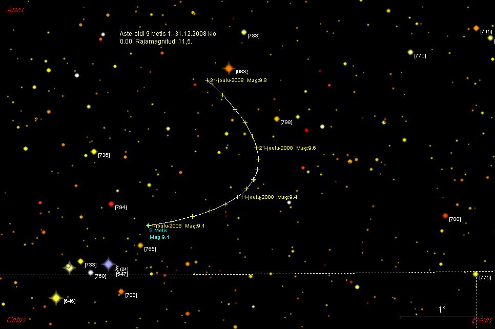 9 Metis on joulukuun alussa 0,7° kaakkoon tähdestä ksi Ari (5,47 mag).