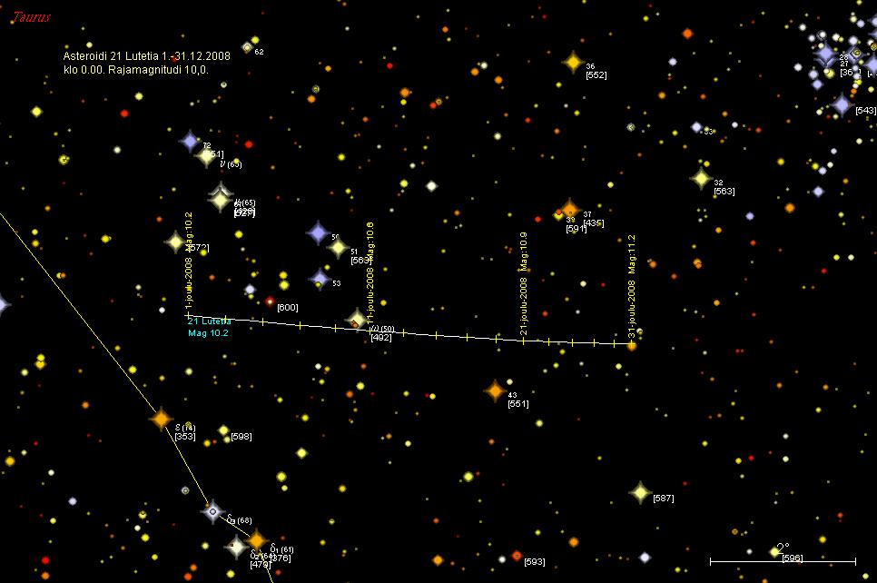 etelään tähdestä 62 Tau (6,34 mag). Kuun lopussa Lutetia on 0,7°