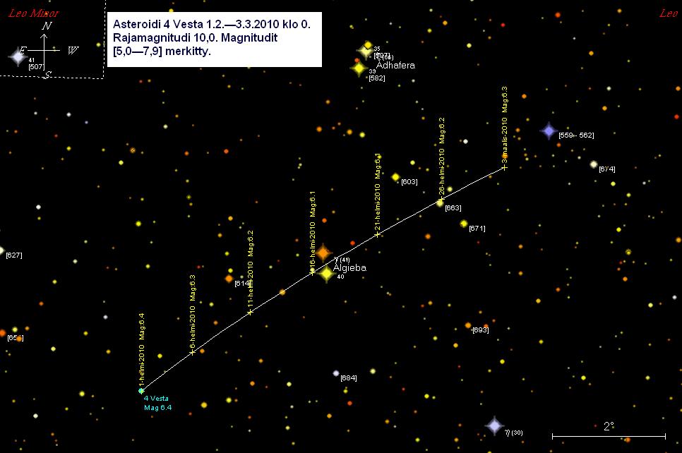 4 Vesta on helmikuun alussa neljä astetta kaakkoon Algiebasta (Gamma Leonis,
