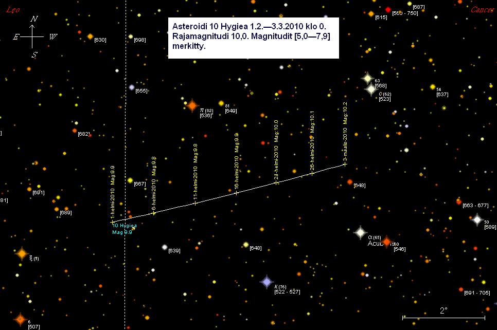 10 Hygiea on helmikuun alussa kaksi astetta itäkaakkoon Ksii Leoniksesta (4,97