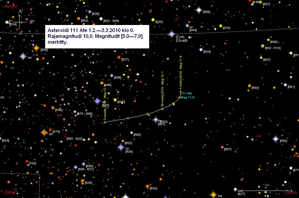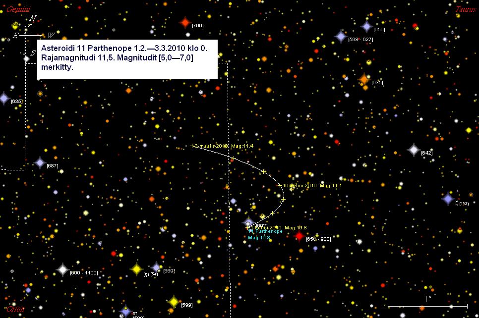 11 Parthenope helmikuun alussa 2,5 astetta itään Tseeta Taurista (2,88 - 3,17