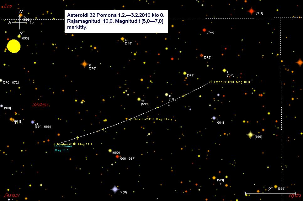 32 Pomona on helmikuun alussa kolme astetta koilliseen Alfa Sextantiksesta (4,48 mag).
