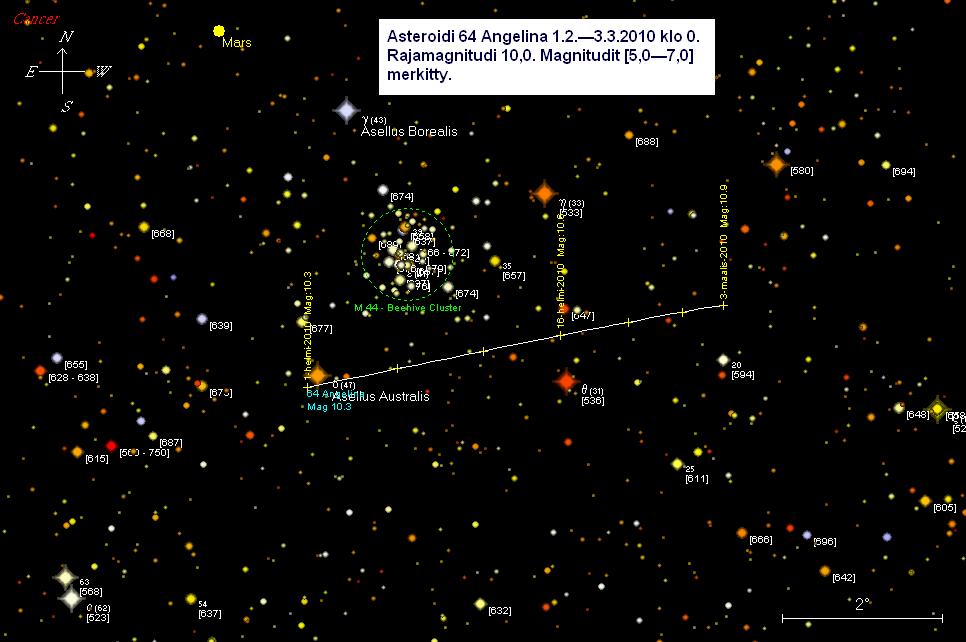 etäisyydellä Praesepen (M44) tähtijoukosta. Asteroidi on kuun alussa