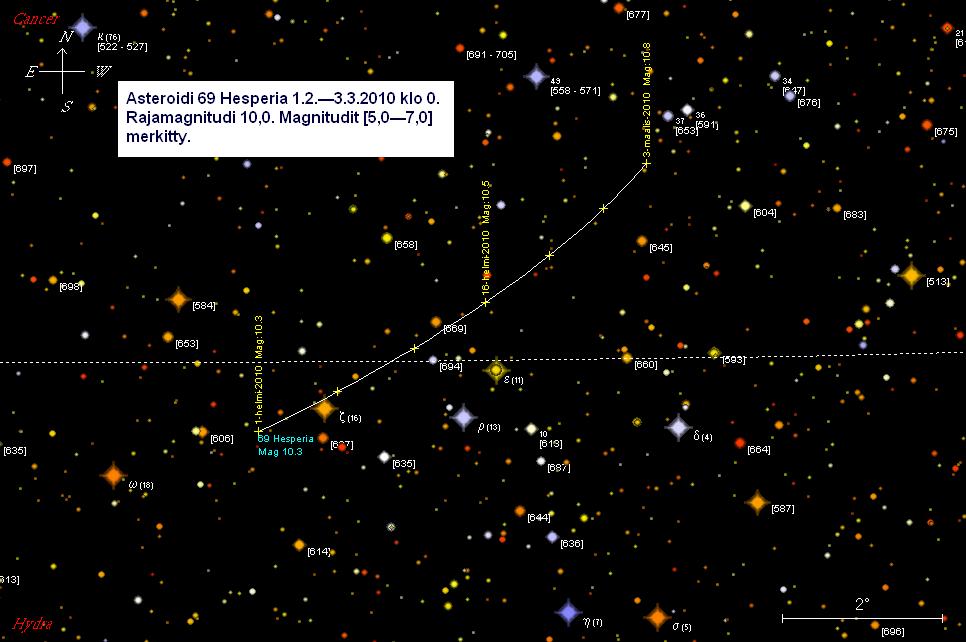 69 Hesperia on helmikuun alussa 0,9 astetta itäkaakkoon tähdestä Tseeta
