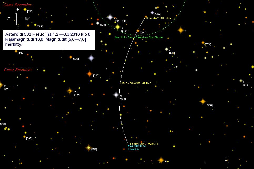 11 Comae. Asteroidin taantuva liike alkaa 12. helmikuuta. Herculina siirtyy 26.