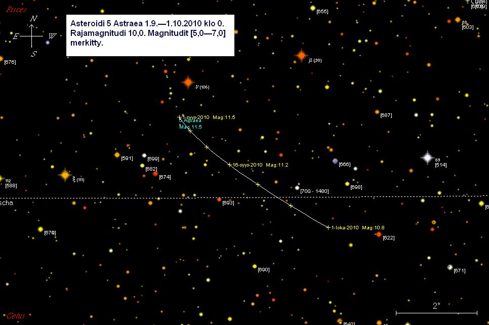 5 Astraea on syyskuun alussa 0,9 astetta etelään Nyy Pisciumista (4,44 mag).