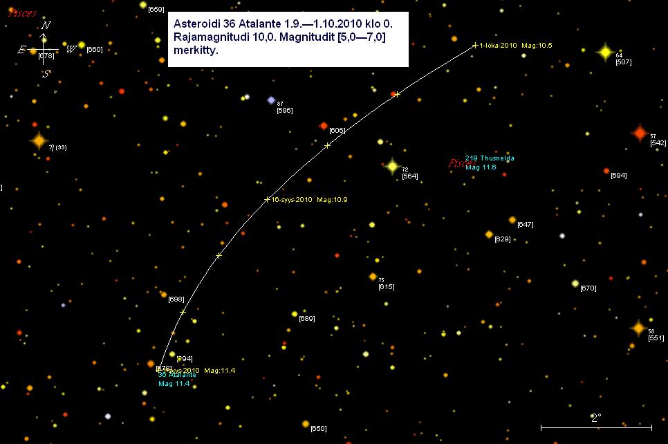 36 Atalante on syyskuun alussa neljä astetta koilliseen Tseta Pisciumista (5,19