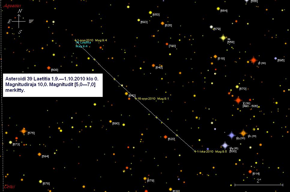 39 Laetitia on syyskuun alussa 7,5 astetta itään Fii Aquariista (4,25 mag).