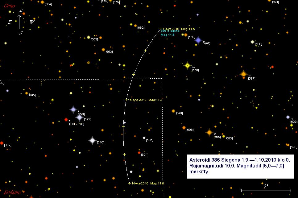 386 Siegena on syyskuun alussa 1,6 astetta itään Delta Ceti