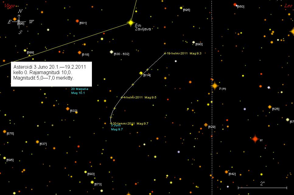 (4,31 mag). Asteroidi aloittaa taantuvan liikkeensä 23.1.2011. Juno on tammikuun