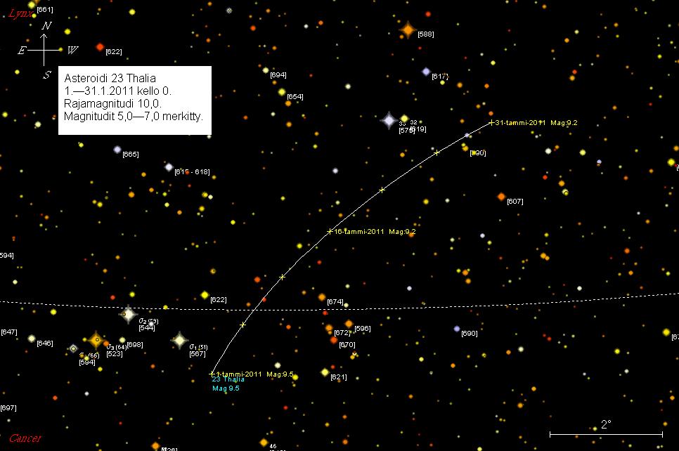 23 Thalia on tammikuun alussa 3,12 astetta pohjoiseen Iota Cancri -tähdestä