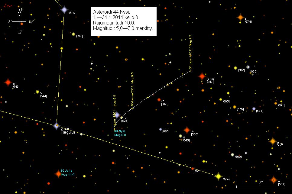 44 Nysa on tammikuun alussa 2,4 astetta länteen Reguluksesta. 9. tammikuuta Nysa