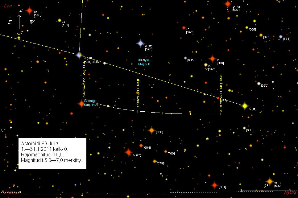89 Julia on tammikuun alussa 1,7 astetta etelään Reguluksesta ja 0,2 astetta