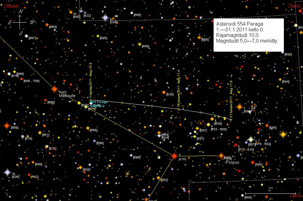 554 Peraga on tammikuun alussa 1,5 astetta länsilounaaseen Mebsutasta (Epsilon
