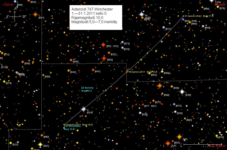 747 Winchester on tammikuun alussa 1,3 astetta kaakkoon 11 Canis Minoris -tähdestä