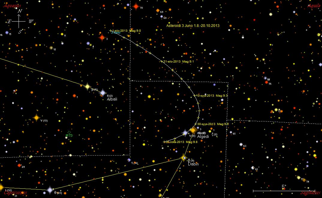 3 Juno on elokuun alussa viisi astetta pohjoiseen Epsilon Aquariista (3,76 mag). Pikkuplaneetan liike muuttuu