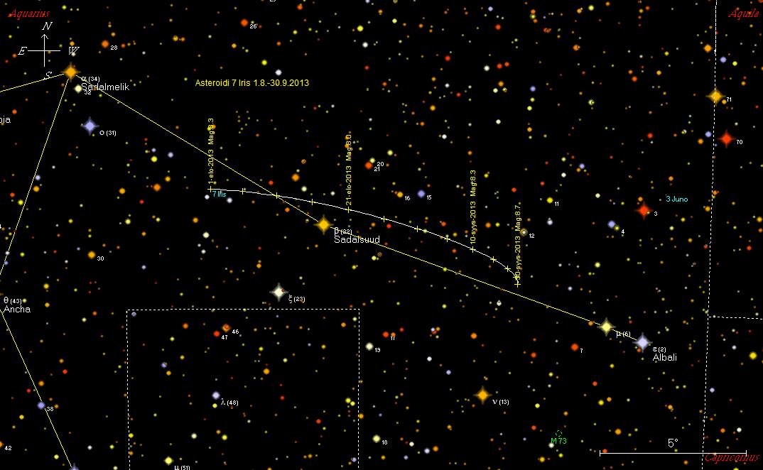 pikkuplaneetta on 0,7 astetta pohjoiseen Salalsuudista (Beta Aquarii, 2,87 mag). Iris on syyskuun lopussa