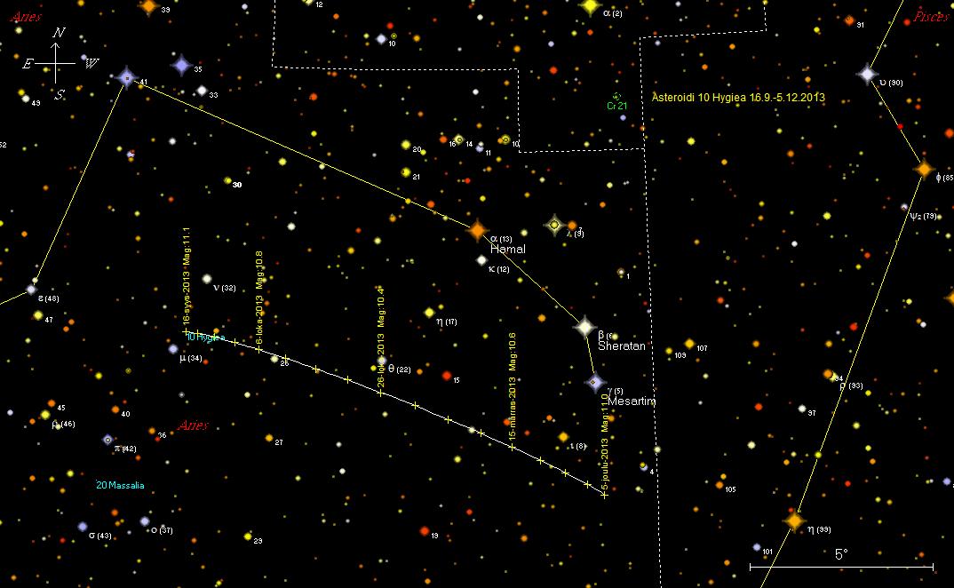 10 Hygiea on syyskuun puolivälissä 0,6 astetta luoteeseen Myy Arietikseen (5,73 mag). Pikkuplaneetta on