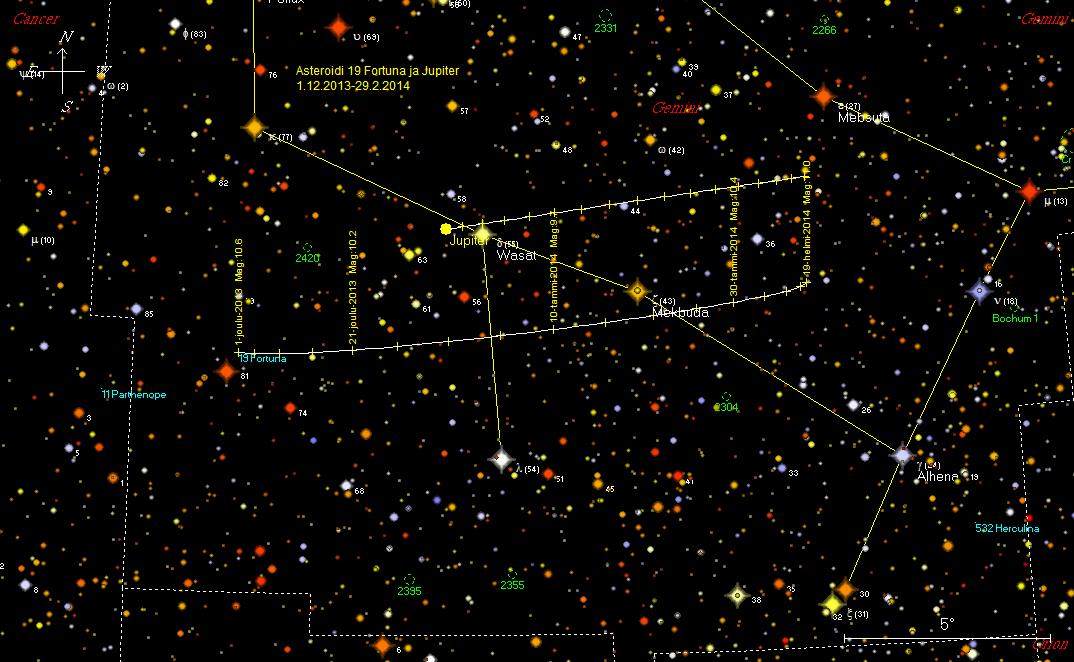 19 Fortuna on joulukuun alussa puoli astetta luoteeseen 81 Geminorumista (4,88 mag). Pikkuplaneetta on