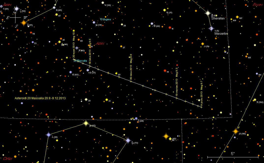 20 Massalia on syyskuun puolivälissä kuusi astetta lounaaseen Delta Arietiksesta (4,34 mag). Pikkuplaneetta