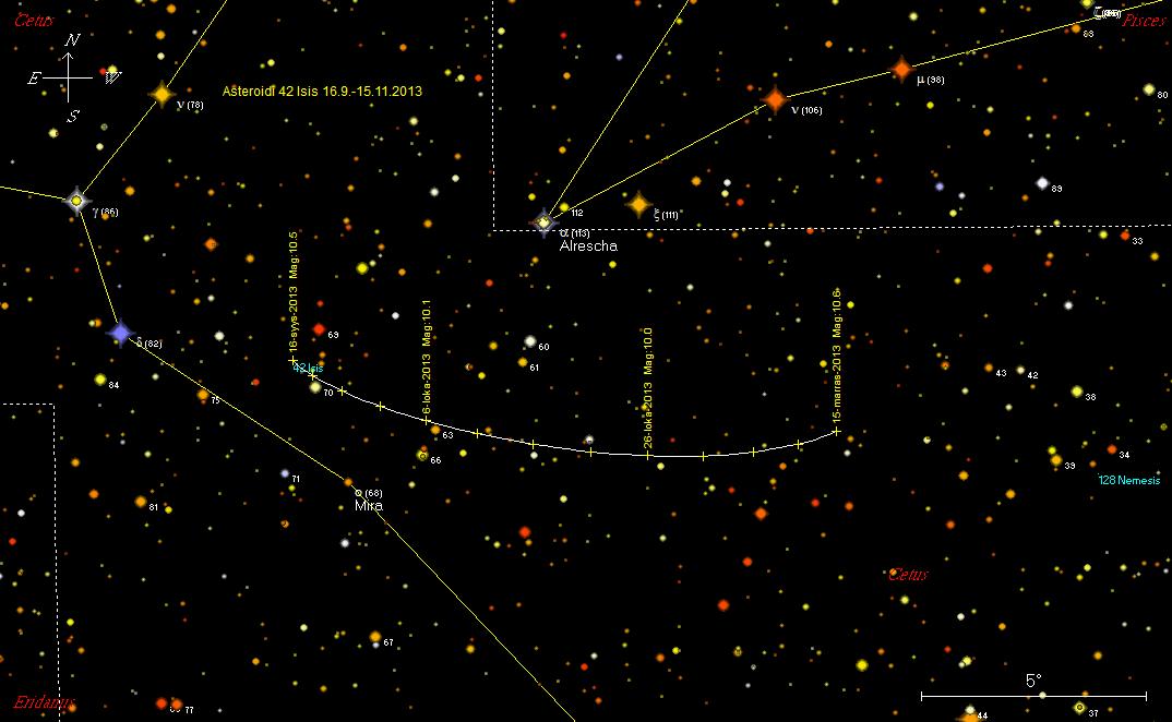 15./16.10. viisi astetta etelään Alreschasta (Alfa Piscium, 3,82 - 3,83 mag). Isiksen liike muuttuu 3.12.