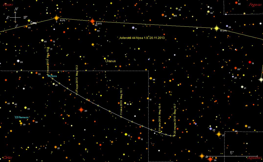 44 Nysa on elokuun puolivälissä viisi astetta etelään Epsilon Pisciumista (4,26 mag). Pikkuplaneetta kulkee