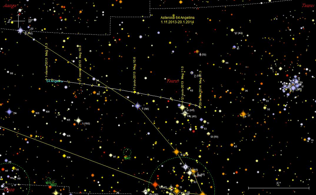 64 Angelina on marraskuun puolivälissä kolme astetta pohjoiseen 105 Taurista (5,82 - 5,96 mag).