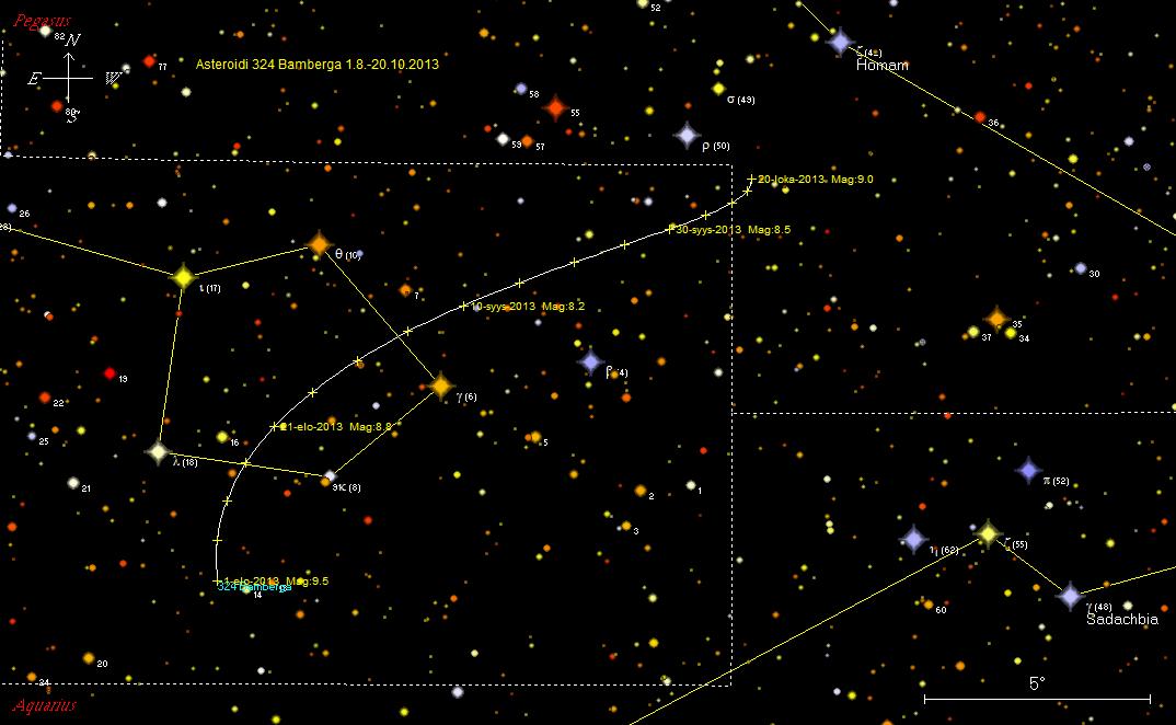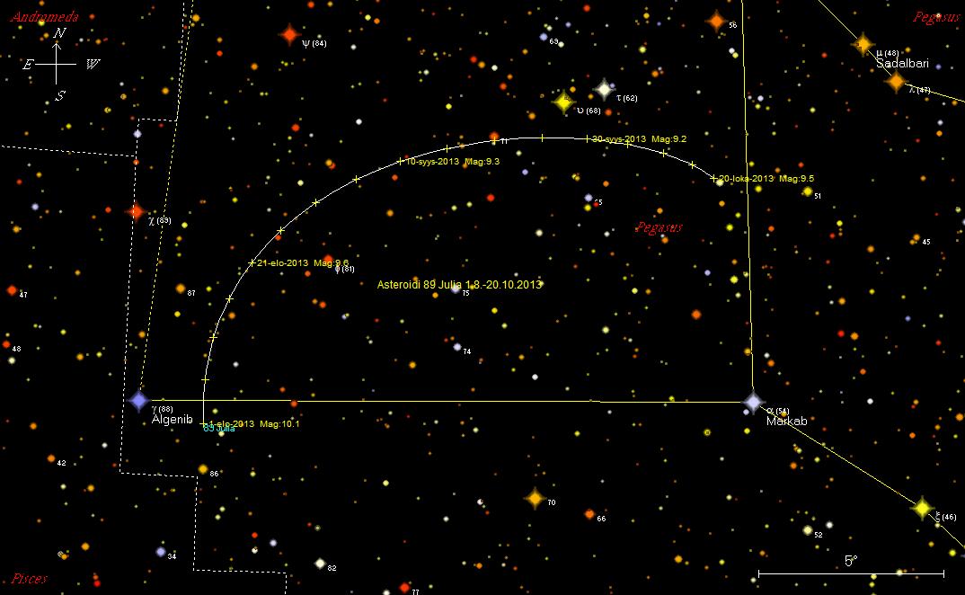 etelään Ypsilon Pegasista (4,43 mag). Syyskuun lopussa pikkuplaneetta on kaksi astetta itään 51 Pegasista