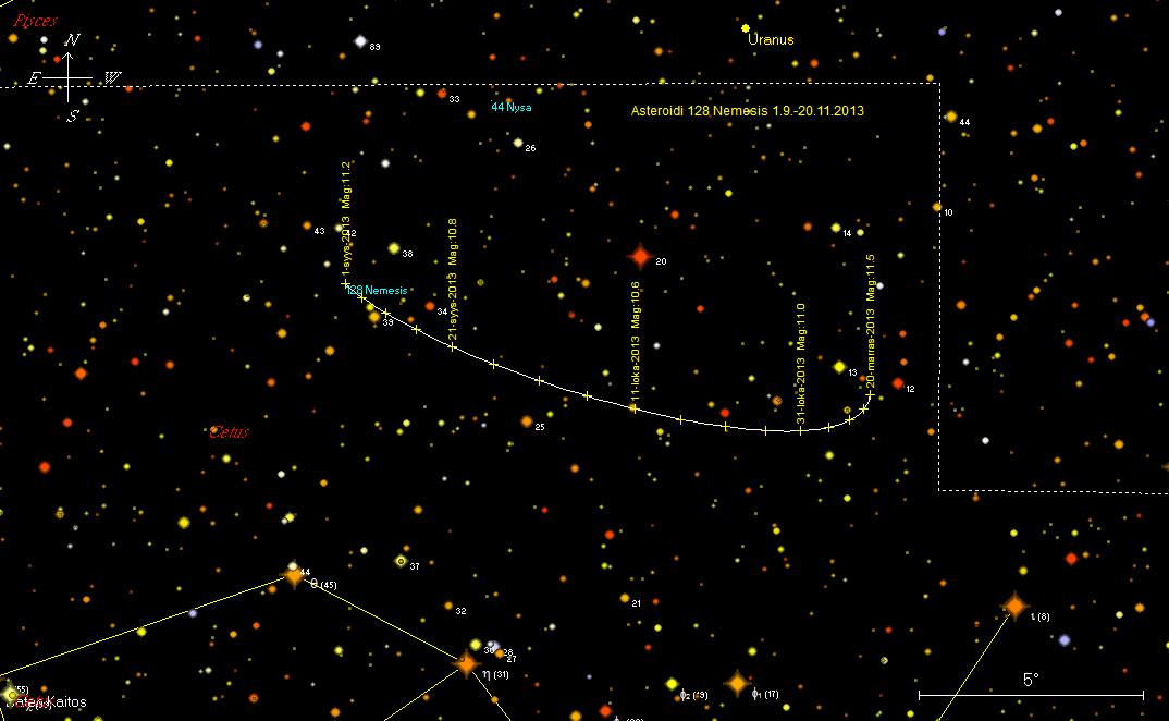 Nemesis on 24./25.11. tähtien 12 Ceti (5,73 mag) ja 13 Ceti (3,86 - 3,96 mag) välisen viivan puolivälissä.