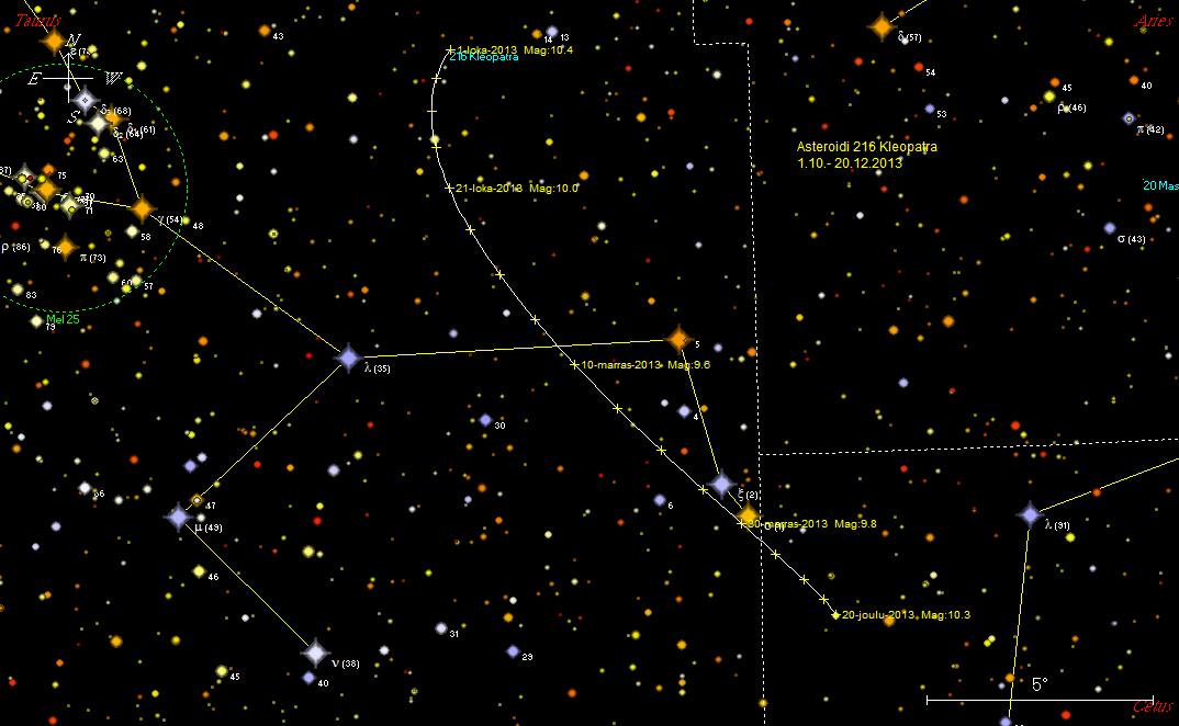kolme astetta itään 5 Taurista (4,13 mag). Kleopatra on 25./26.11. 0,3 astetta kaakkoon Ksii Taurista
