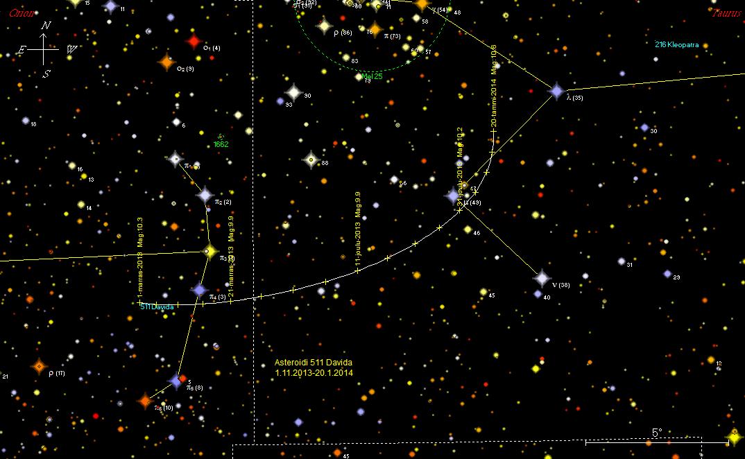 511 Davida on marraskuun alussa 3,5 astetta pohjoiseen Pii 6 Orioniksesta (4,47 mag). Pikkuplaneetta on