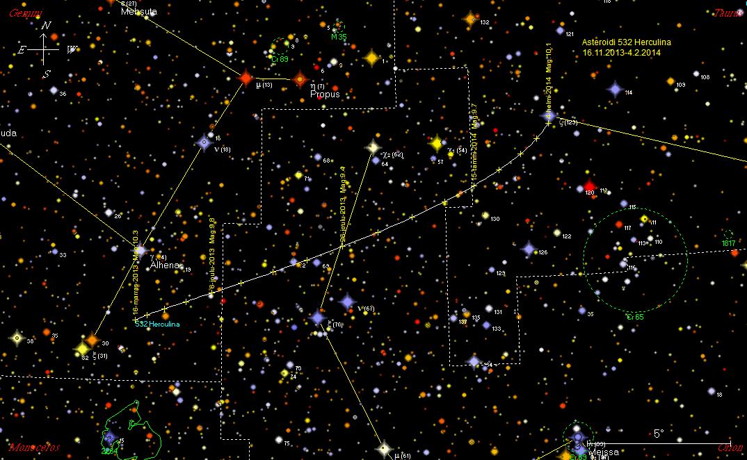 532 Herculina on marraskuun puolivälissä kaksi astetta luoteeseen Ksii Geminorumista (3,33 mag).