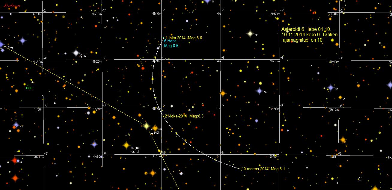 Asteroidi 6 Hebe on lokakuun alussa neljä astetta pohjoisluoteeseen Eridanuksen Beidistä