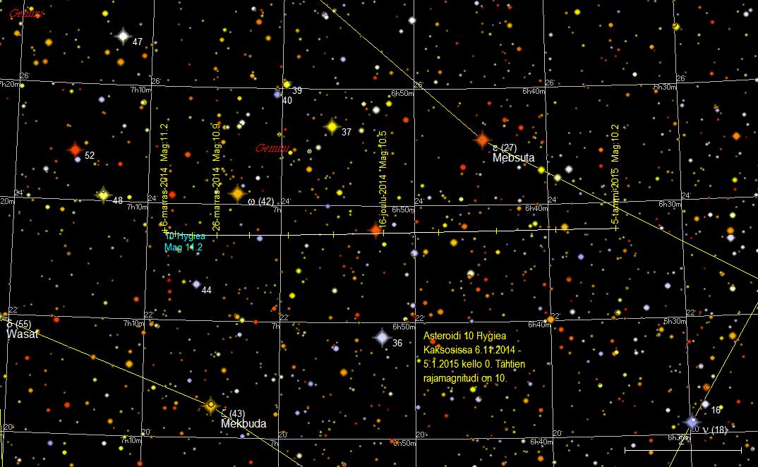 Asteroidi 10 Hygiea on marraskuun alussa kolme astetta luoteeseen Kaksosten Wasatista (Delta Geminorum,