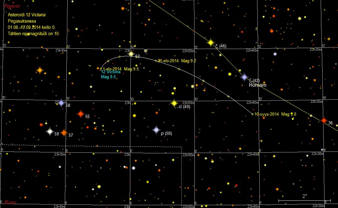 Victoria ohittaa 13.-15. elokuuta etelän puolelta tähden 52 Pegasi (5,79 mag) 0,1 asteen